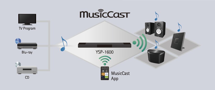 MusicCast employs a high performance wireless network to deliver music and audio enjoyment. It can stream digital music content from your smartphone, PC or NAS to other MusicCast devices in your home. It can also share the music from external devices such as a TV or BD player connected to the YSP-1600. Audio content from Bluetooth-connected smartphones or tablets can also be streamed to MusicCast devices in multiple rooms.