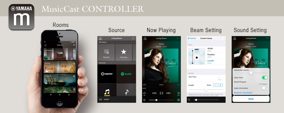 The MusicCast Controller app can be used with a single MusicCast product or with multiple MusicCast products. The app features a beautifully designed display, which you can customise to your taste. Operation requires simply tapping the display, making it extremely easy to enjoy the music you want to hear. In addition, by using the YSP-1600 Beam setting or surround adjustments, you can perform detailed sound adjustment.