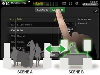 The scene memory features banks A and B, each capable of holding up to 100 scenes. That’s a total of 200 scenes that can be set up and instantly recalled whenever needed. A number of scenes are pre-programmed to give users a head start: scenes with the 1-knob COMP and 1-knob EQ controls engaged for the easiest possible operation, and scenes with the 1-knob features disabled for experienced engineers who might want to follow an established procedure. The banks are great for organizing different types of scenes: one for scenes categorized by music type, and the other by event type, for example.