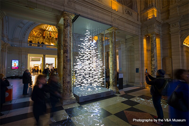 Located in the main Cromwell Road entrance of the V&A, The Singing Tree’s concept is for museum visitors to create a new Christmas carol by each contributing a word. Using eight high powered projectors with advanced pixel-dividing technology, these words are projected onto a thousand tiny planks of birch plywood, threaded onto vertical wires and arranged in the familiar shape of a spruce tree.