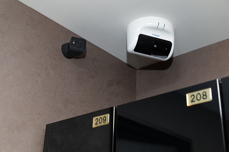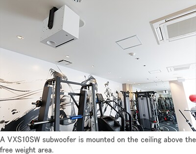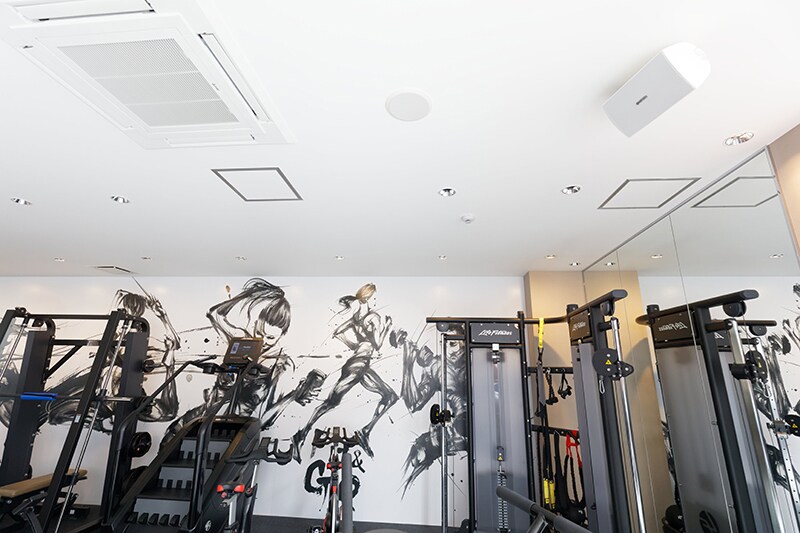 I am convinced that as your pulse rises when you exercise, feeling a low-frequency beat with your body can provide a subtle boost in motivation. We were already determined to approach music playback seriously at Fit&Go, so we decided to include a subwoofer that would enhance the interplay between the music and fitness. There wasn’t much space available in the gym area, so we suspended the subwoofer from the ceiling. That has turned out very well.