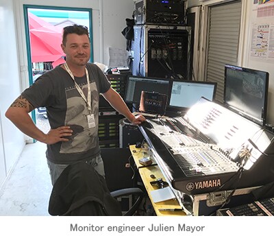 Monitor engineer Julien Mayor used another CL5, with 16 mixes on a combination of wedges and in-ears, including over 100 FM receivers. This also had DVS installed for recording the shows. All inputs and outputs were handled by four Rio3224-D2 I/O racks, while two 01V96 consoles - one at each mix position - were used for all the technical communications.