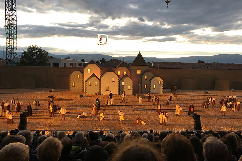 Fête du Blé et du Pain took place from 15th - 28th August, with the ten, two-hour performances of Solstices transforming what is normally a large parking area into a giant theatre set, complete with scenery village, windmills, fields and a large temporary grandstand for the audience. Drawing inspiration from real events, the epic production celebrated the strong historic bond between the people and the land of the region.