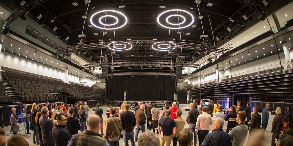 Featuring a wide range of conference facilities and a 4500-seat sports arena, the O2 universum was the perfect location to set up demonstration immersive sound systems in both the largest conference room and the arena, as well as comparing them to a large format NEXO L-R line array system flown in the arena.