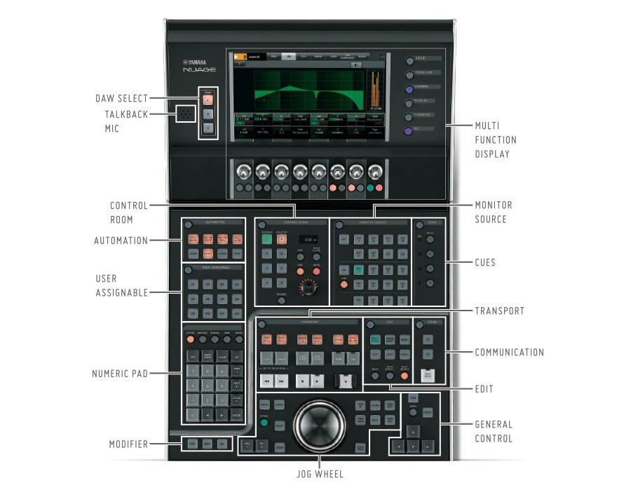 Nuage supports remote control of Yamaha’s MMP1 Studio Monitor Management System so that source selection, levels, downmix and dimmer switching, talkback, and other functions can be controlled directly from physical controls on a Nuage Master or Nuage Fader unit. And because these functions can be accessed even when there is no computer or DAW online, monitor section operation is as direct and immediate as on a mixing console.