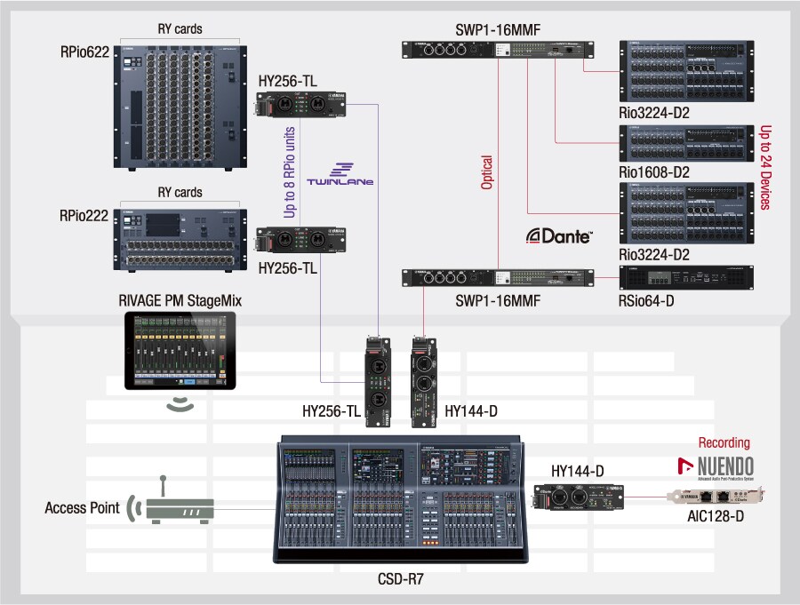 In RIVAGE PM systems it is possible to combine and simultaneously operate Rio3224-D2/Rio1608-D2 units connected via Dante, and RPio622/RPio222 units connected via TWINLANe. A Dante network can accommodate up to 24 Dante devices, including Rio3224-D2/Rio1608-D2 units, while a TWINLANe network can connect up to eight RPio622/RPio222 units. The entire system can operate at 96 kHz.