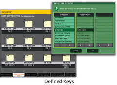 The 12 User Defined Keys can be assigned to perform a range of handy functions. You could assign one for tap-tempo input of delay times, others to jump to specific display screens, to control specified mute groups, or activate talkback, for example. An innovative User Defined Key function is "Set by SEL", with which the channel [SEL] keys perform a range of alternate functions if pressed while the assigned User Defined Key is held: reset the defaults for that channel, turn phantom power on or off, set the channel fader to nominal... and more.