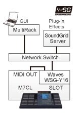 The Waves SoundGrid system is an external plug-in platform developed specifically for live sound. With a WSG-Y16 interface card installed in one of the M7CL expansion slots, the Waves MultiRack application running on a laptop computer, and a Waves SoundGrid Server, sound engineers can deploy multiple instances of renowned Waves plug-ins in the live sound environment, with extremely low latency. M7CL and SoundGrid scene recall can be linked via a simple MIDI connection.