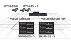 In addition to three SB168-ES stage boxes connected via the console's Ethernet ports, up to three additional SB168-ES units can be connected via MY16-ES64 and MY16-EX cards installed in the expansion slots. Up to 96 sources can be connected to, and controlled by, the M7CL-48ES. And any 48 of these can be selected for mixing at any one time by simply switching scenes.