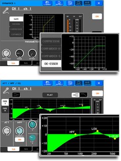 DYNAMICS 1 adjusts gate threshold level for input channels, or compressor threshold level for mix, matrix, or stereo/mono channels. DYNAMICS 2 adjusts compressor threshold level for input channels. In either case the actual parameter controlled depends on the dynamics processor selected from the well-stocked dynamics library provided - gates, compressors, expanders, and even de-essers for advanced vocal processing. Although initially set up for gate + compressor processing, you can also use dual compressors.