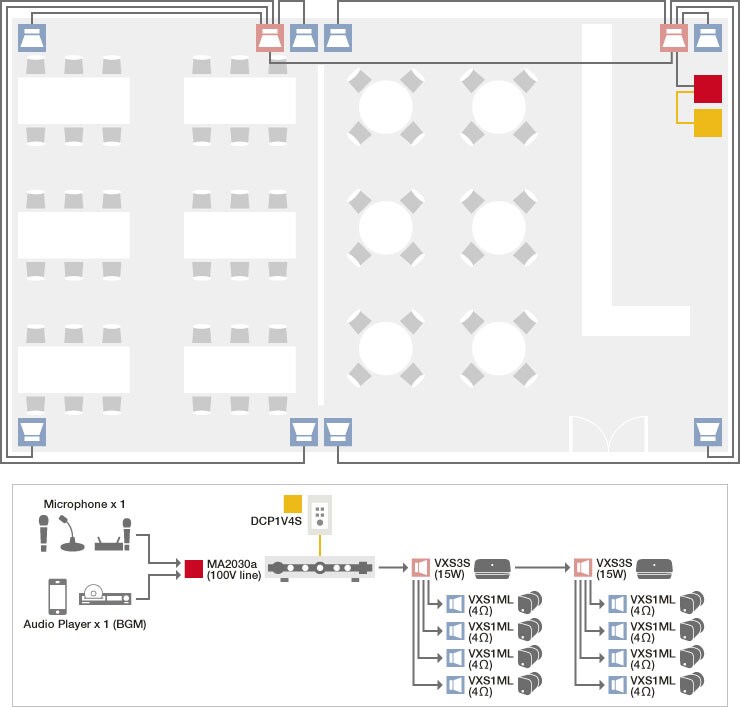 This is a system that connected VXS3S with high impedance and constructed multiple satellites. You can easily change the required volume by switching the output W number by tapping. The MA2120 can deliver different sources at different volumes in the respective zone.