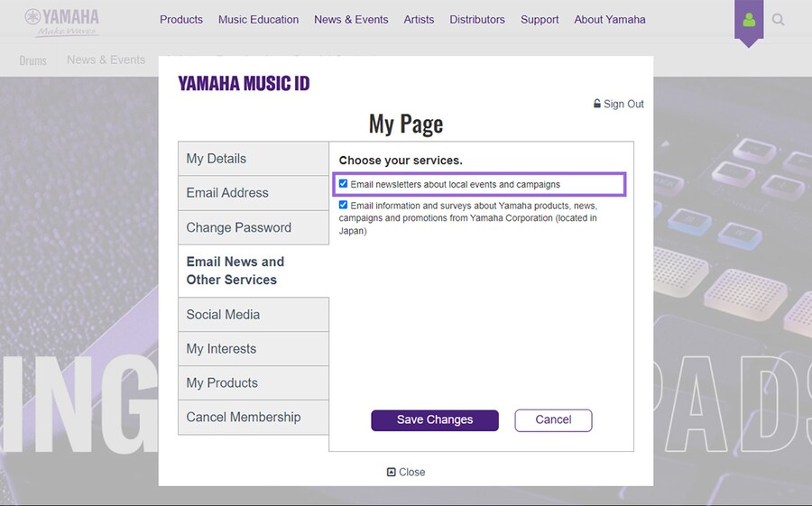 4. you have already registered on Yamaha Music ID, please ensure that “Email newsletters about local events and campaigns” is checked in the “Email News and Other Services” section of My Page (Refer to the image below).