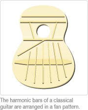Pieces of wood called harmonic bars are placed on the inside of the top plate of the guitar.
