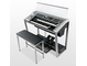 The frame is constructed to ensure pedal play is visible from any direction. The entire instrument is angled forward toward the player, creating a more dynamic appearance for the listener.