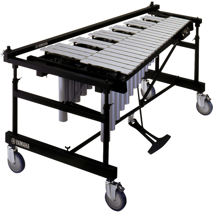 The YVRD-2700(G) multi-frame vibraphone offers the focused sound of the silver satin finish or gold mirror finish aluminum alloy bars with an exceptionally smooth mechanical operation. A one-piece upper frame and dual crossbars allow transport while set-up - while oversized, swivel pedal and height adjustment encourage player comfort.