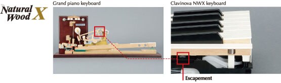 The NWX keyboards also feature an escapement mechanism that reproduces a slight clicking sensation near the bottom of the key dip, and they have been designed in such a way that the click is discernible only on the lightest keystrokes, similar to the keyboard of a grand piano.