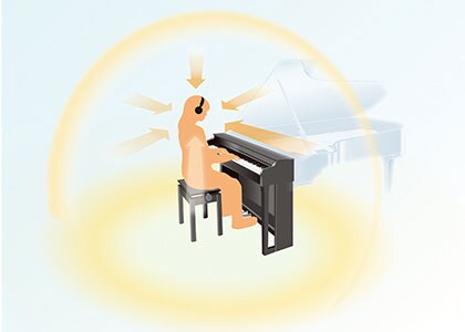 When using headphones, the Stereophonic Optimizer lets players enjoy the dispersed sound heard when sitting in front of an acoustic piano. With the Stereophonic Optimizer, Voices sampled from acoustic pianos* appear to come from the body of the instrument. This provides a comfortable, natural experience that removes the drawbacks of performing with headphones.