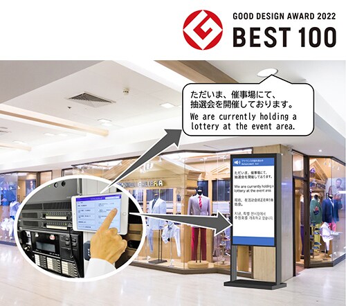 An app that makes broadcasting multilingual announcements easy. Users can choose from a selection of generic preset announcements suitable for a wide variety of businesses and situations. Making a multilingual announcement is as simple as tapping the desired announcement on the tablet screen. Corresponding text can also be displayed on signage, making it possible to deliver information equally to a diverse audience, regardless of language ability, hearing ability, etc. The system is utilized in a variety of facilities, such as shopping malls, stations, and stadiums, for both ordinary use and disaster situations.