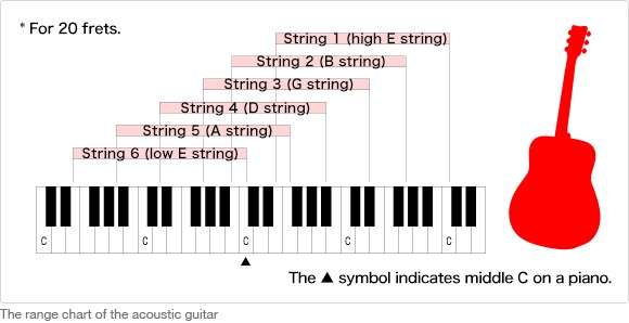 As strings become shorter their pitch increases. Guitars are designed to use this property so that the pitch they produce increases a semitone each time the position the string is held down at changes. The metallic parts on the neck are called frets. A player uses his or her left hand to hold the strings down in the spaces between the frets. There are a total of 20 frets for 20 semitones. This means that, for instance, string 6 can play from low E to C on the second octave (weak). However, the strings can be difficult to press nearer the sound hole, so this area is not often used.