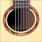 The sound hole is decorated with an original inlay design of mahogany, padauk, and abalone. The NCX Series uses a round hole shape (left) while the NTX Series is elliptical (right).