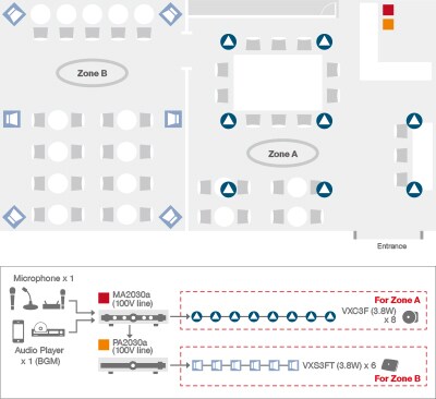 The combination of VXS3F/VXS3FT speakers and VXS10S/VXS10ST subwoofers is recommended to enhance the power and excitement of rhythmic music. A single unit of MA2120, which has independently controllable two output channels, would be a good choice for broadcasting announcements or advertisements while supplying background music. It allows users to create a comfortable, agreeable environment by carefully adjusting the output volume of each channel. The DCP1V4S control panel installed in the area allow remote control of background music volume and other operations.