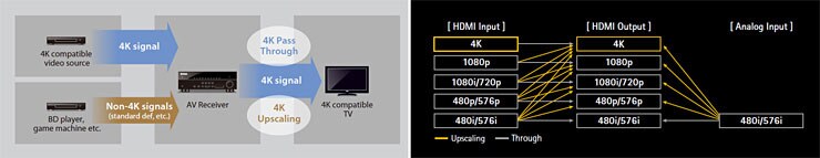 This AV receiver's HDMI input / output supports 4K video image pass-through. It also can perform 4K upscaling to boost a lower resolution image to super high-def resolution. This ensures compatibility with the latest super high resolution video formats.
