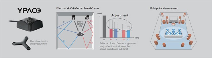YPAO analyses room acoustics and performs speaker angle measurements, then calibrates audio parameters to achieve optimum sound at any of several listening positions. It employs Reflected Sound Control to correct early reflections for studio-quality sound. It also provides DSP Effect Normalisation, which varies the CINEMA DSP parameters according to the reflected sounds.