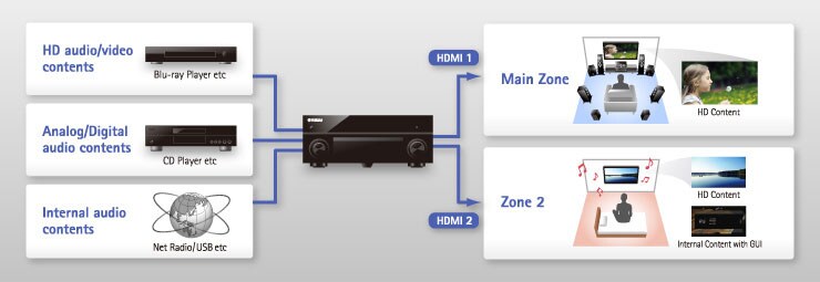 While standard HDMI zone switching can only send HD video programmes to the main and second zones, Yamaha’s Advanced HDMI Zone Switching adds the capability to choose from all audio and video sources for playback in either zone. An on-screen graphical user interface makes it easy to browse and select content to enjoy from the second zone no matter what is being played in the main zone.