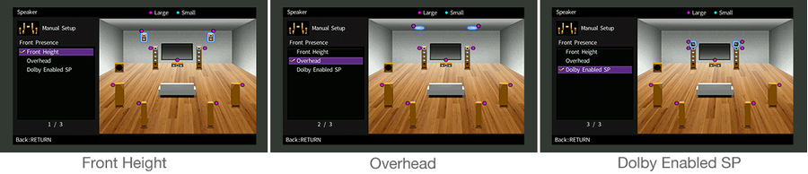 Yamaha provide multiple placement patterns for presence speakers that support Dolby Atmos, creating a sound field that’s ideal for your setup. Any layout can be appropriately reproduced, including the three-dimensional space of CINEMA DSP as well as Dolby Atmos.