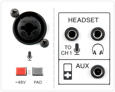 - +48V phantom power on CH1 input for condenser mics and Dl boxes.