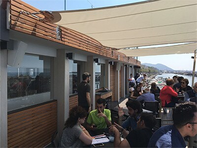 The indoor zones are in the restaurant (VXS3F and HS8S loudspeakers), restaurant kitchen (NS-IC800), bar/takeaway counter (VXS5, VXS10S, NS-IC800, NS-IC400) and the information point (NS-IC800). The outside zones comprise the bar terrace (IP35-rated VXS8), upstairs terrace (IP35-rated VXS5 and VXS10S), the Champagneria (VXS8) and a separate zone for when live performances and DJ sets are taking place on the upstairs terrace (DSR112 and DXS18).