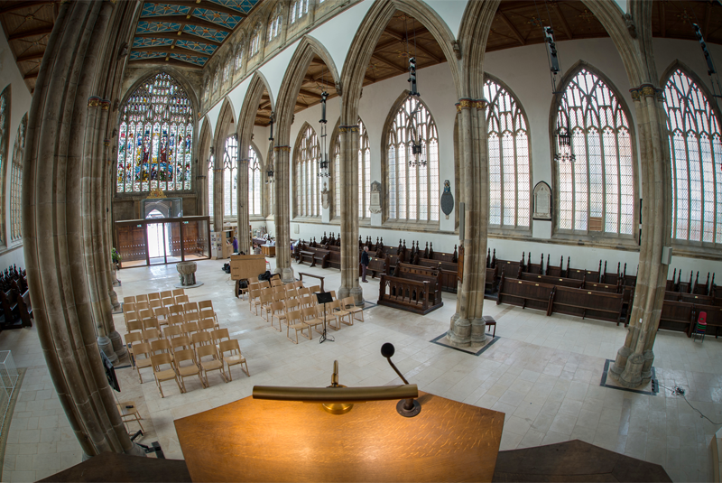 Covering the full length of the Nave and the chancel, the Dante network forms the backbone of a Yamaha audio system comprising a Yamaha TF3 digital mixer, a pair of TIO1608-D stage boxes and an MTX5-D matrix processor.