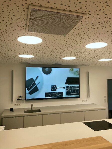 With the ADECIA ceiling microphone solution, speakers can be easily recorded in natural sound during meetings as well as during demonstrations in the kitchen, and also always remain clearly intelligible to the receiving party - regardless of where they are located. In addition, the line array speakers reproduce the speech of the remote side in best quality and volume. The ceiling microphone remains visually discreet. The white speakers, which are powered by PoE, blend in perfectly with the room environment. With the ceiling microphone, all participants in the room can be recorded, as it completely covers the meeting room and the show kitchen. ADECIA's automatic sound optimisation and convenient calibration procedure also made commissioning particularly easy. They enable an optimal sound even without structural changes, for example by additional sound elements. The easy set-up and calibration of the system makes it possible to make major changes to the room's décor and still get the best audio quality without being a sound expert.