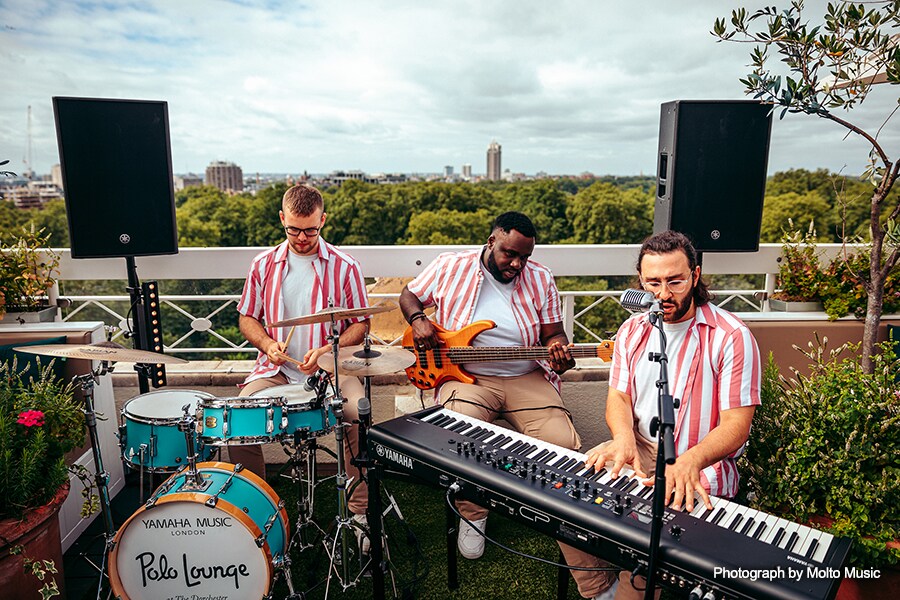 As well as Yamaha mixing and sound reinforcement in all its venues, Molto Music provides Yamaha instruments for the performers. For The Dorchester Rooftop, these comprised a CP88 stage piano, Stage Custom Hip 20 drum kit and TRB-1005J five-string bass guitar.