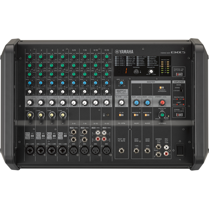 Box-type robust and portable powered mixer featuring high efficiency power amplifier of 710W and mixer with comprehensive effects, Flex 9 Graphic Equalizer, speaker preset and built-in feedback suppressor.