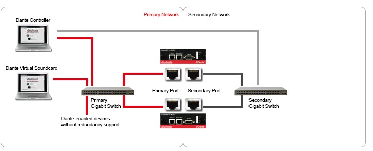 - การ์ด Dante-MY16-AUD2 สามารถเชื่อมต่อกันผ่านทางพอร์ตที่สองของ Ethernet ได้