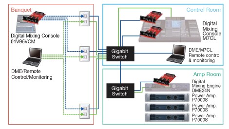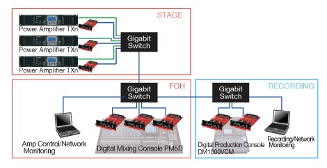 ในรูปนี้คอนโซล Yamaha LS9 ทำหน้าที่เป็นตัวควบคุม HA ระยะไกล เชื่อมต่อผ่านพอร์ต Ethernet หลักบนการ์ด Dante-MY16-AUD ที่ติดตั้งไว้ที่สวิทช์เครือข่าย การ์ด Dante-MY16-AUD ถูกตั้งค่าเป็น HA ระยะไกลโหมด2 ควบคุมสัญญาณจาก Dante Controller (สำหรับรายละเอียดโปรดดูคู่มือการใช้งาน Dante-MY16-AUD v1.23)