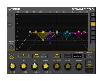Dynamic EQ6 ในขณะนี้สามารถตอบสนองความต้องการด้าน EQ ของคุณได้ทั้งหมดด้วยอีควอไลเซอร์แบบไดนามิก 6 แบนด์ EQ แบบไดนามิกรุ่นใหม่นี้มีการเพิ่มชุดคุณสมบัติจากที่เคยมีใน Dynamic EQ/EQ4 รุ่นก่อนหน้า ค่าเกนแบบคงที่จะเพิ่มความสามารถของตัวกรอง การประมวลผลตรงกลาง/ด้านข้างจะช่วยให้สามารถแก้ไขแบนด์ตรงกลางหรือความกว้างของสัญญาณสเตอริโอได้ นอกจากนี้ยังเพิ่มตัวกรองโลพาส/ไฮพาส และฟังก์ชัน Auto Threshold มาให้อีกด้วยเพื่ออำนวยความสะดวก แต่ละแบนด์จะมีตัวกรอง Key-In Filter ที่สามารถควบคุมพื้นที่ความถี่ที่กระตุ้นการทำงานของ EQ แบบไดนามิกได้อย่างอิสระ