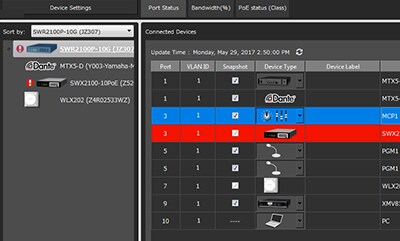 "SWR2311P-10G" เป็นสวิทช์อัจฉริยะ L2 ที่ให้ฟังก์ชั่นการทำงานอุดมคติสำหรับเครือข่ายเสียงดิจิทัล Dante ที่ถูกพัฒนาโดย Audinate Corporation และปัจจุบันถูกใช้กันทั่วโลกแล้ว ซึ่งทำให้สามารถสร้างเครือข่ายที่มีเสถียรภาพซึ่งลดความยุ่งยากในการตั้งค่า การมอนิเตอร์ การจัดการ และการใช้งาน เมื่อคุณเชื่อมต่อ VXL1-16P กับ SWR2311P-10G การตั้งค่าที่เหมาะสมที่สุดสำหรับ Dante จะทำโดยอัตโนมัติผ่านทาง LLDP ซึ่งเป็นโปรโตคอลสำหรับการส่งผ่านข้อมูลการจัดการระบบระหว่างอุปกรณ์และอุปกรณ์ที่อยู่ใกล้เคียงกัน พอร์ทที่สามารถทำงานร่วมกับ PoE สามารถจ่ายกระแสไฟได้สูงสุด 30 W สำหรับพอร์ตทั้งหมดพร้อมกัน ความสามารถในการจ่ายพลังงานได้ไม่เพียงแต่อุปกรณ์ที่สามารถทำงานร่วมกับ PoE เช่น ตัวควบคุมติดผนัง “MCP1” ที่ใช้สำหรับควบคุมระดับเสียงของอุปกรณ์ที่ใช้ในห้องสัมมนา หรือจุดเข้าใช้งานแบบไร้สาย และยังสามารถให้พลังงานเพียงพอสำหรับการใช้งานแม้กระทั่งอุปกรณ์ที่ต้องการ PoE ที่มีเอาท์พุตสูงกว่า เช่น VXL1B-16P หรือ VXL1W-16P