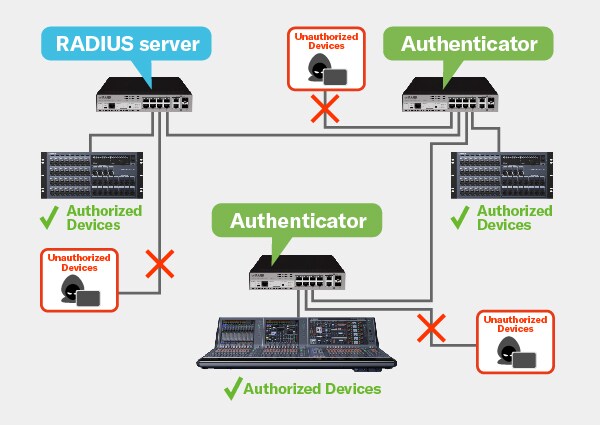 - การกำหนดให้สวิตช์หนึ่งเป็นเซิร์ฟเวอร์ RADIUS แล้วเชื่อมโยงสวิตช์อื่นๆ จะทำให้สามารถบล็อกการเข้าถึงเครือข่ายที่ไม่ได้รับอนุญาตได้อย่างมีประสิทธิภาพเพื่อยกระดับการรักษาความปลอดภัย