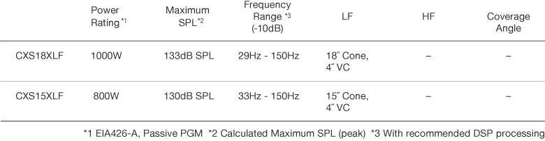 CXS XLF ซีรีส์เป็นซับวูฟเฟอร์แบบพาสซีฟที่ให้กำลังขับสูงและเสียงย่านความถี่ต่ำที่โดดเด่นด้วยโครงสร้างที่มีน้ำหนักเบา พกพาได้ง่ายและแข็งแรงทนทาน สัมผัสย่านเสียงต่ำที่แตกต่างไปจากเดิม ซับวูฟเฟอร์แบบพาสซีฟ CXS XLF ซีรีส์สามารถขยายความถี่ต่ำของระบบลงไปที่เริ่มต้นที่ 29Hz เพื่อขีดความสามารถความถี่ต่ำที่น่าทึ่ง