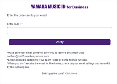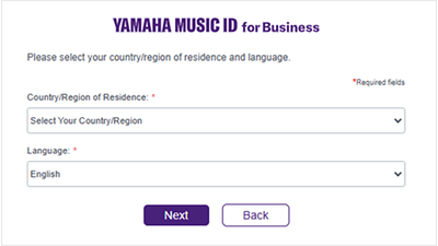 - หากคุณมี Yamaha Music ID for Business อยู่แล้ว: ให้ป้อนข้อมูลการรับรองตัวตนของคุณเพื่อเข้าสู่ระบบและดำเนินการต่อไปยังขั้นตอนที่ 5 โดยตรง