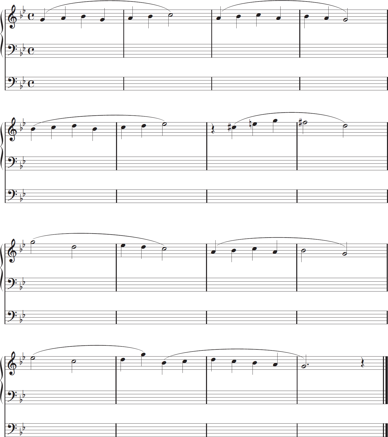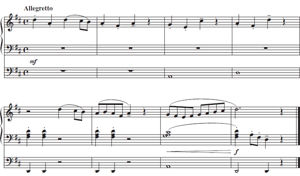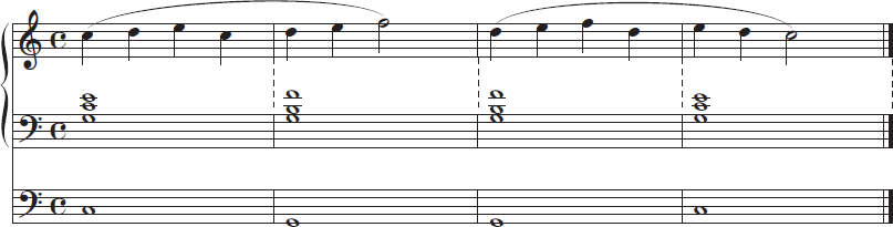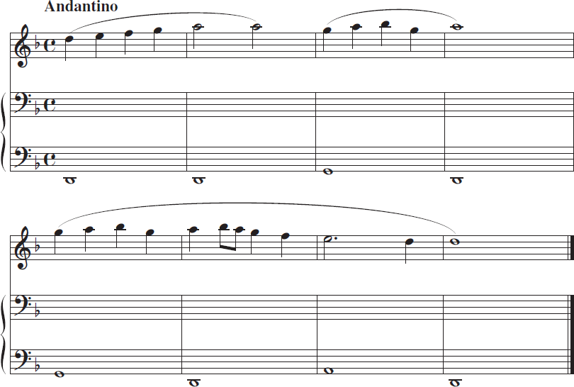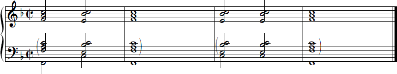 3. ในขณะที่ผู้คุมสอบเล่นเมโลดี้เป็นครั้งที่ 2 ผู้เข้าสอบจะต้องเล่นตามด้วยคอร์ดที่เหมาะสมที่สุดโดยใช้ทั้ง 2 มือ และยึดตามโน้ตเสียงเบสที่ได้รับ