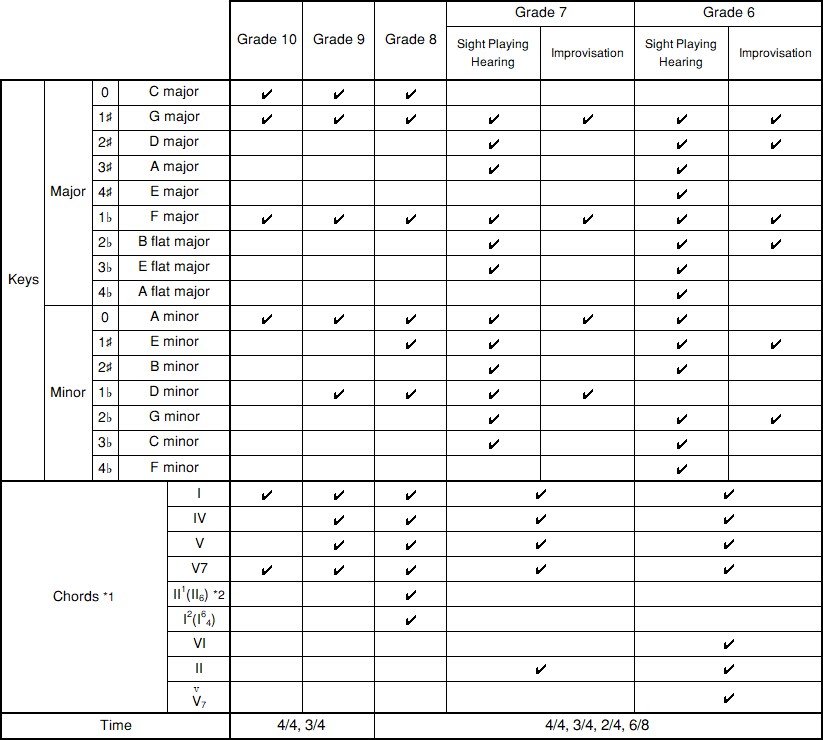 คีย์และคอร์ดสำหรับการเล่นแบบดูโน้ต การเล่นเสียงบรรเลงประกอบ (เกรด 10-8) การเล่นแบบด้นสด (เกรด 7,6) และการฟัง