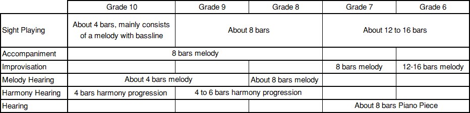 - Suite และ Sonatina เป็นต้น จะถูกนับเป็นบทเพลงเดียว แม้ว่าผู้ทดสอบจะเล่นบทเพลงเดียวหรือเล่นทั้งหมดก็ตาม (การแสดงท่าทาง)