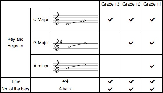 3. ผู้คุมสอบจะเล่นในครึ่งแรก จากนั้นผู้ทดสอบจะต้องเล่น/ขับร้อง (เกรด 13), เล่นตามเมโลดี้จากการฟัง (เกรด 12, 11) ผู้คุมสอบจะเล่นเมโลดี้ไปจนจบเพลงหากผู้ทดสอบขับร้อง (เกรด 13)