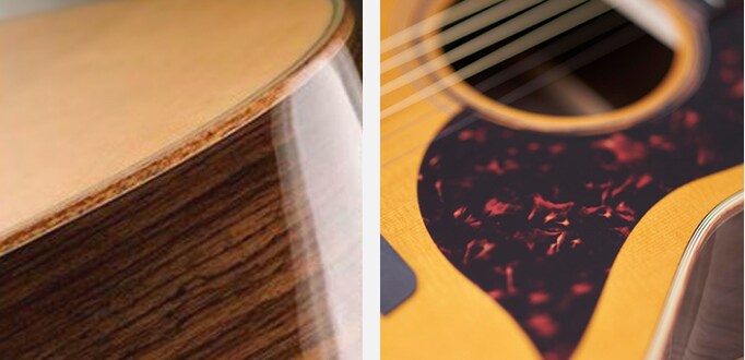 The simple, organic design features wood binding and other techniques that capture the warmth of wood. The distinctive shape of the pick guard, which stands out when performing, is a revival of the N1000 guitar that Yamaha released in 1975.