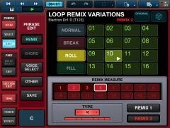 Using the powerful LOOP REMIX function, it is possible to divide selected phrases at specified intervals and then order them automatically insert rolls or breaks, and thus rework them into new phrases. In V2.0, two loop remix functions can now be set for one phrase.
