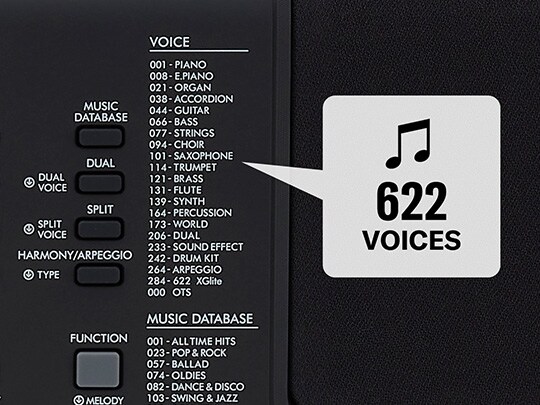 คีย์บอร์ด PSR-E373 นี้มี LSI โทนเจเนอเรเตอร์รุ่นใหม่ล่าสุดซึ่งจะถ่ายทอดเสียงดนตรีคุณภาพสูงอันน่าทึ่ง รวมถึงเอกเฟกต์คุณภาพสูงอื่นๆ ต้องขอบคุณ LSI รุ่นใหม่นี้ที่ทำให้คุณสามารถเพลิดเพลินไปกับคลังเสียงเครื่องดนตรีกว่า 622 รายการ เหมาะกับการเล่นเพลงทุกประเภทที่คุณเลือก รวมถึงฟังก์ชั่น Super Articulation Lite Voices ที่เป็นเอกลักษณ์ ซึ่งจะจำลองการสั่นและเสียงของเครื่องสายประเภทต่างๆ เช่น เชลโล่และแมนโดลิน ซึ่งก่อนหน้านี้เลียนแบบได้ยากได้อย่างเหมือนจริงจนน่าทึ่ง เพื่อการแสดงที่สมจริงที่สุด