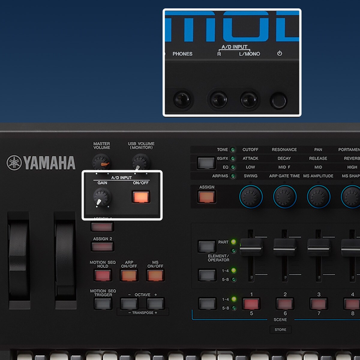 อินพุต A/D สเตอริโอช่วยให้คุณสามารถนำแหล่งสัญญาณภายนอก เช่น ซินธิไซเซอร์อนาล็อก เสียงร้อง และเครื่องดนตรีอื่นๆ เข้าสู่ระบบ Motion Control ของ MODX+ ได้ ซึ่งแปลว่าการควบคุมของ MODX+ จะยอดเยี่ยมกว่าการประมวลผลของเอฟเฟกต์ในตัวของรุ่นทั่วไป ควบคุมแต่ละพารามิเตอร์ด้วยตัวคุณเอง หรือใช้ Motion Control ซึ่งเป็นเหมือน “มือที่มองไม่เห็น” ที่มีให้ใน MODX+ เพิ่ม Vocoder, Envelope Follower และ Auto Beat Sync เพื่อให้อินพุต A/D บน MODX+ กลายเป็นเครื่องมือสำหรับตัวเอง